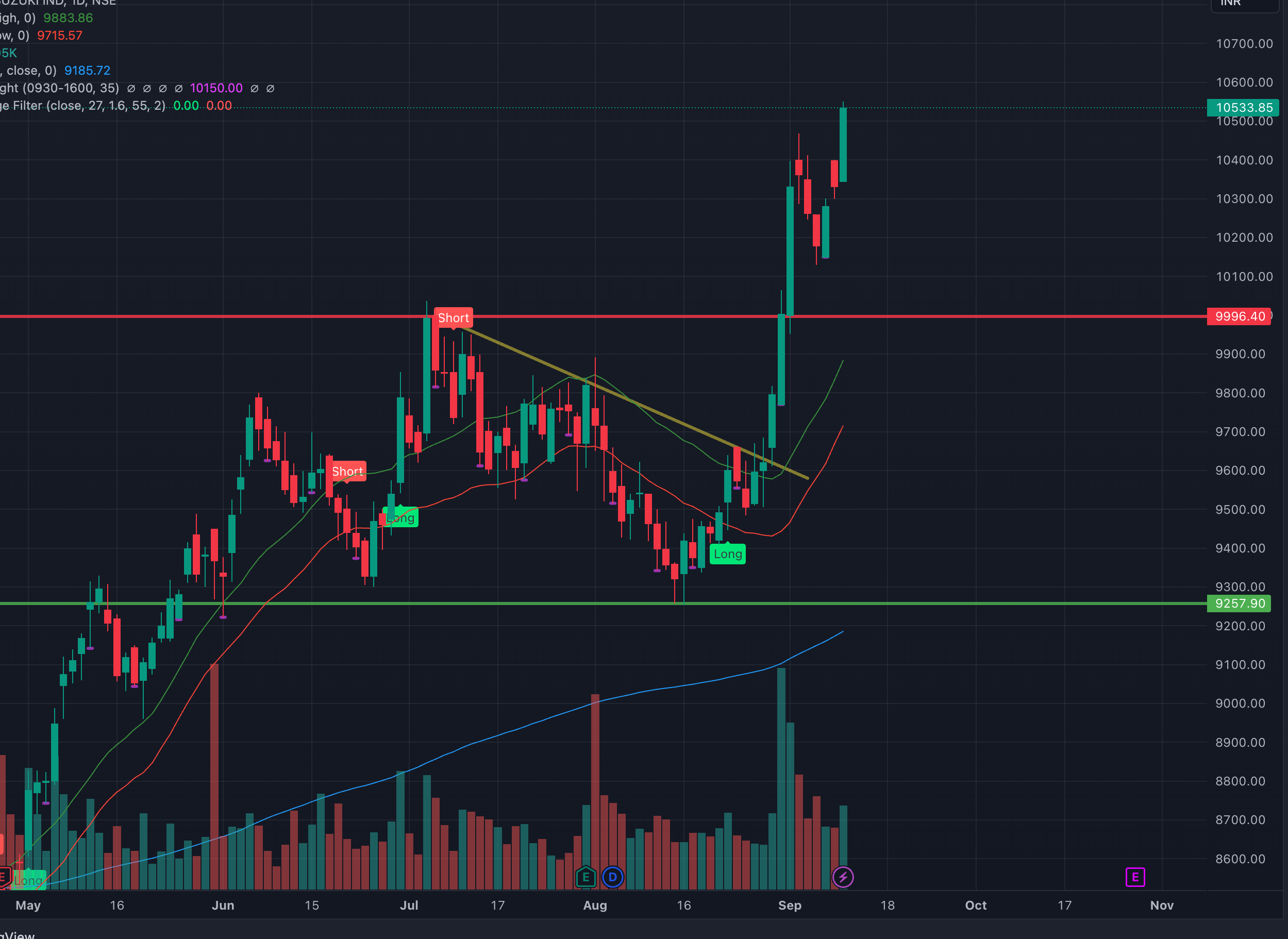 My Maruti options paid off, not really I wish I had taken future or ATM calls or 2 lots. I had taken 10k sept call at 69. it is now at 500 but I sold at 170. Too bad!