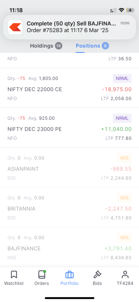 I had written my very first stock predicting algorithm yesterday using Claude and I wanted to try it today so Bajaj finance on buy side and Brittania and Asian paints on sell side. The sell side everything hit stop loss and made new highs in the day but buy side one hit the stop loss and went up 170 points. That would have been gain of 7-8k crazy. Luckily I re-entered and was able to cover the losses from others